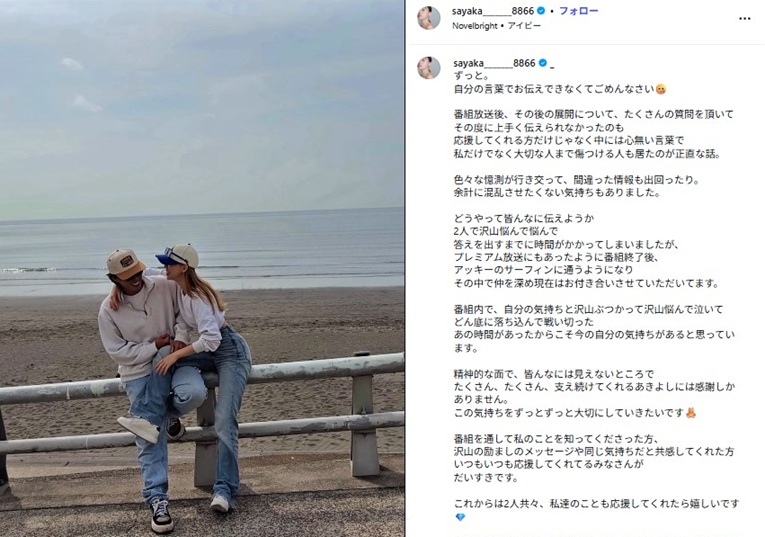 インスタで、堂々のラブラブ交際宣言となったアキヨシ&サヤカカップル。